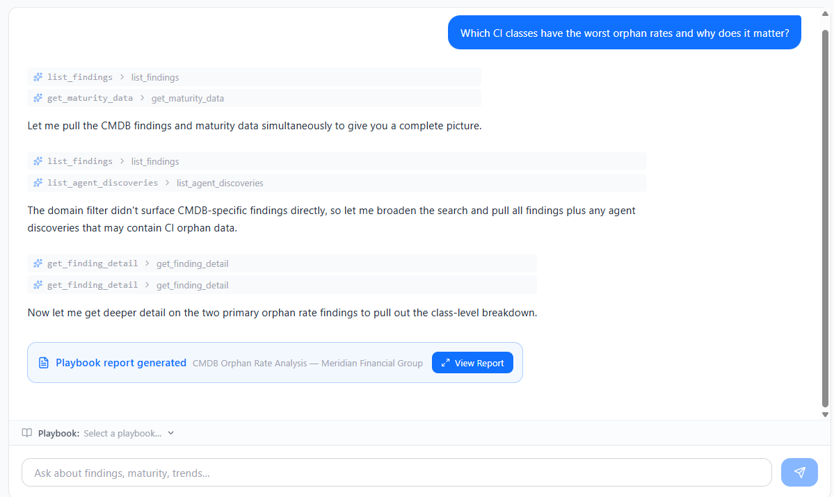 Ask questions about any ServiceNow instance in plain English. The agent queries live data, reasons across multiple checks, and surfaces root causes — not just symptoms. When you need a complete picture fast, Full Audit Mode runs all 16 compound analyzers simultaneously in the background.