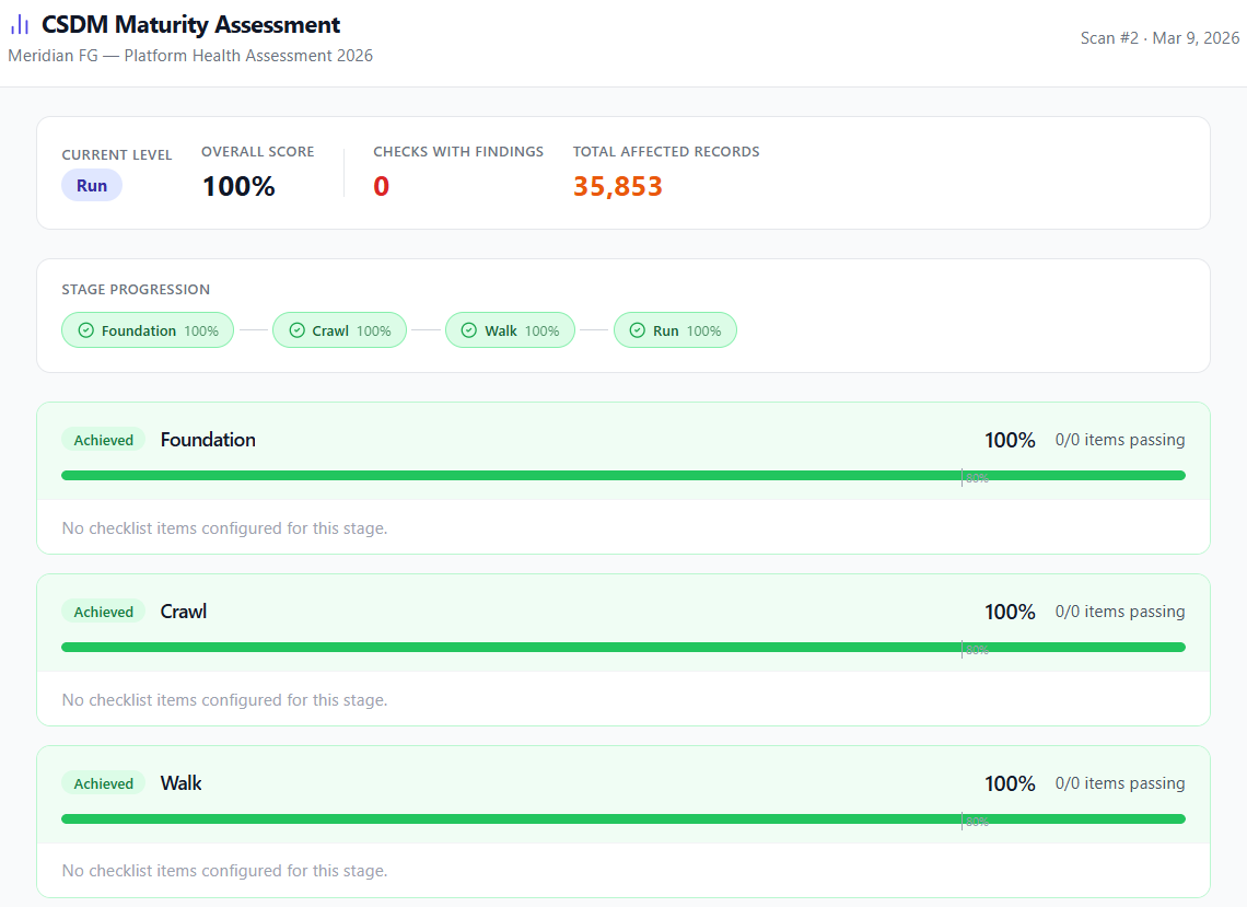 Track where a ServiceNow instance sits across four progressive CSDM maturity stages. Each stage has a scored checklist; advancing requires ≥90% completion. The visual maturity dashboard makes it easy to show clients what they've achieved and what comes next.