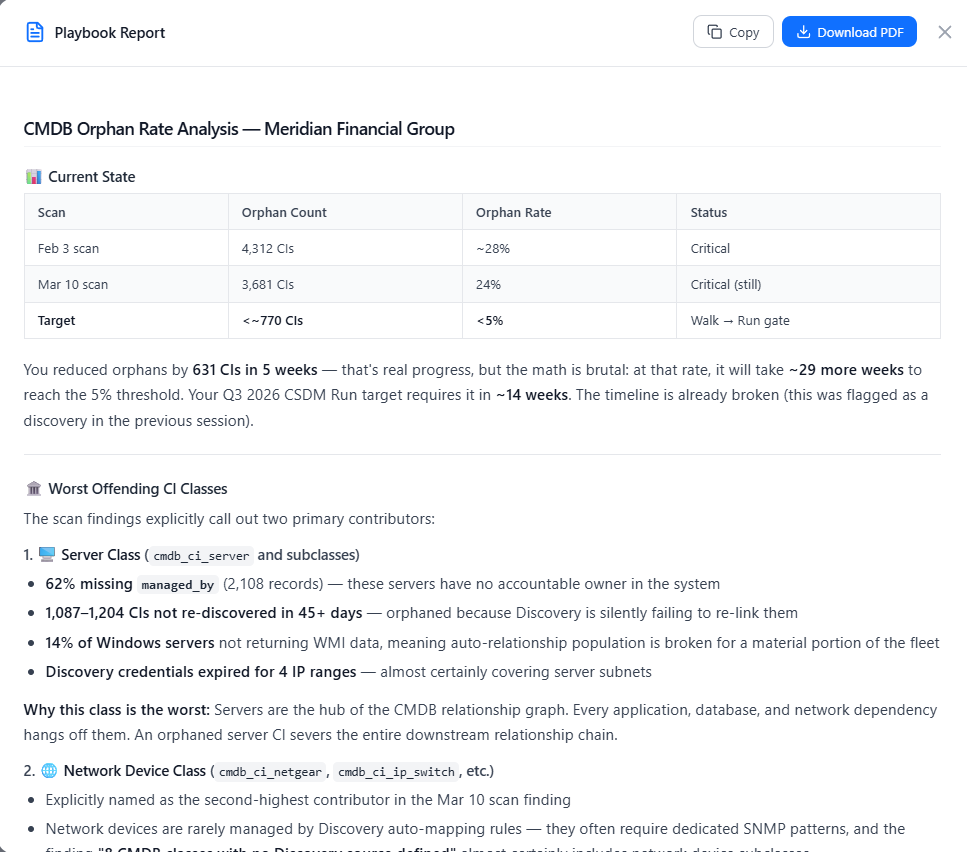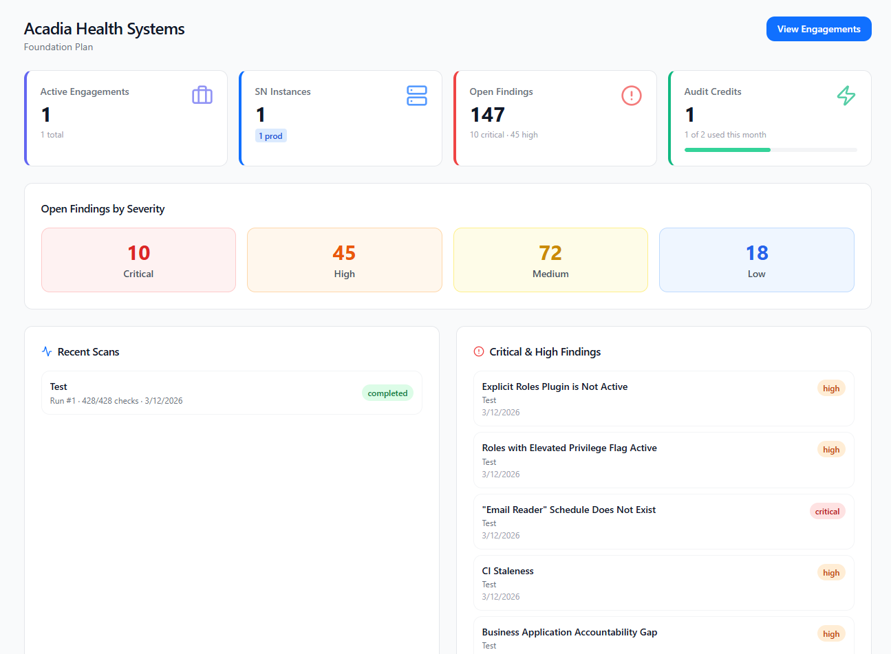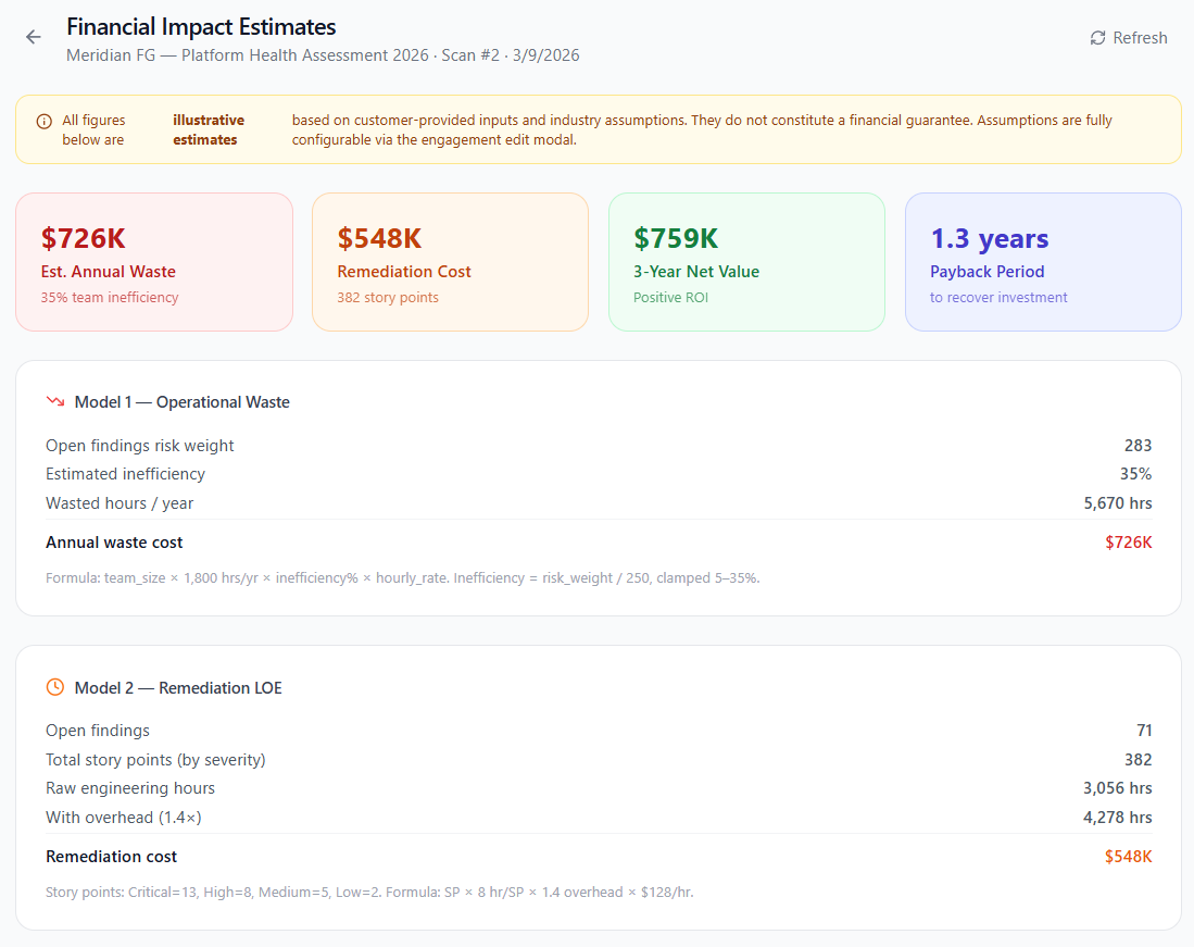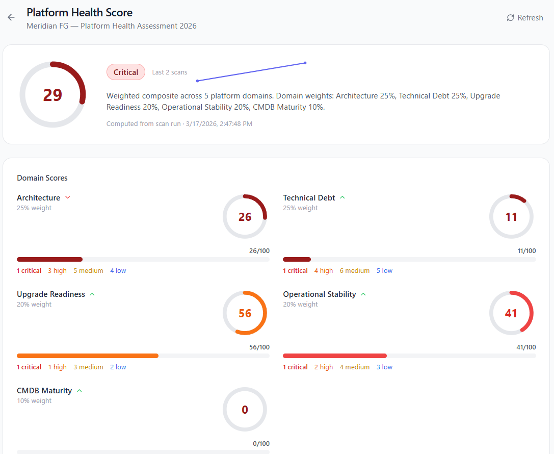 Connect to any ServiceNow instance, run a deep automated assessment, and deliver findings, financial impact, and a prioritized remediation roadmap — all from a single platform.