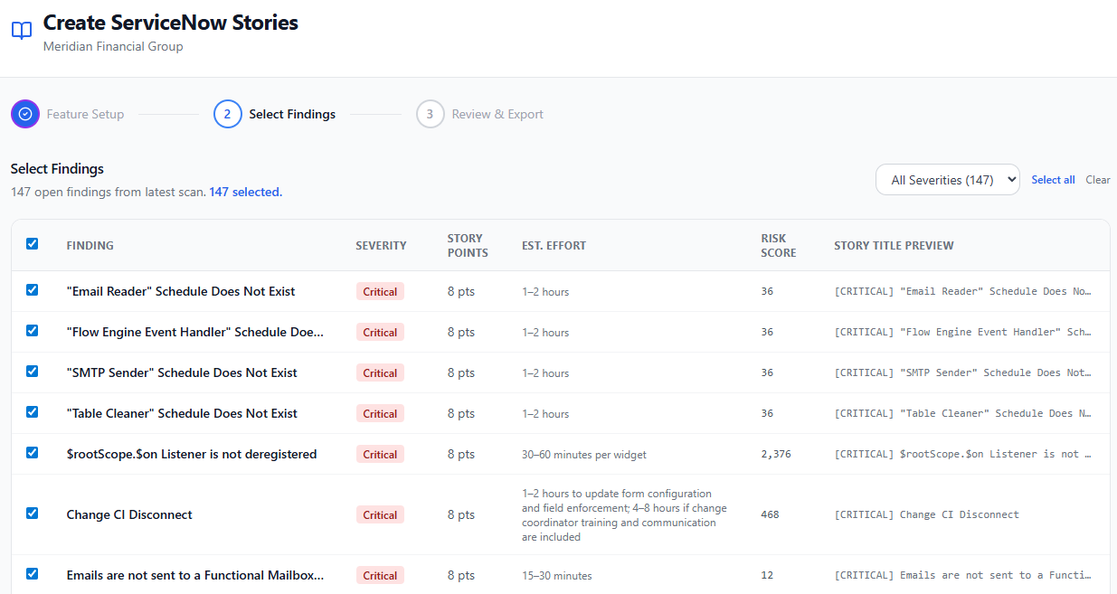 Select any findings and push them into the customer's ServiceNow instance as native rm_story records — no copy-paste, no manual backlog entry. Every story is pre-drafted and sprint-ready on arrival.