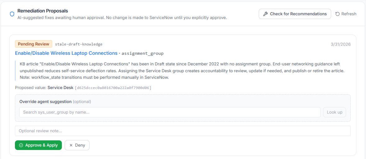 When the AI agent identifies a fixable issue, it proposes a specific field-level change with a rationale and rollback plan. Every proposal sits in a review queue — no write touches your ServiceNow instance without an explicit approval. After approval, OrynIQ applies the change and immediately verifies the result against the live instance.
